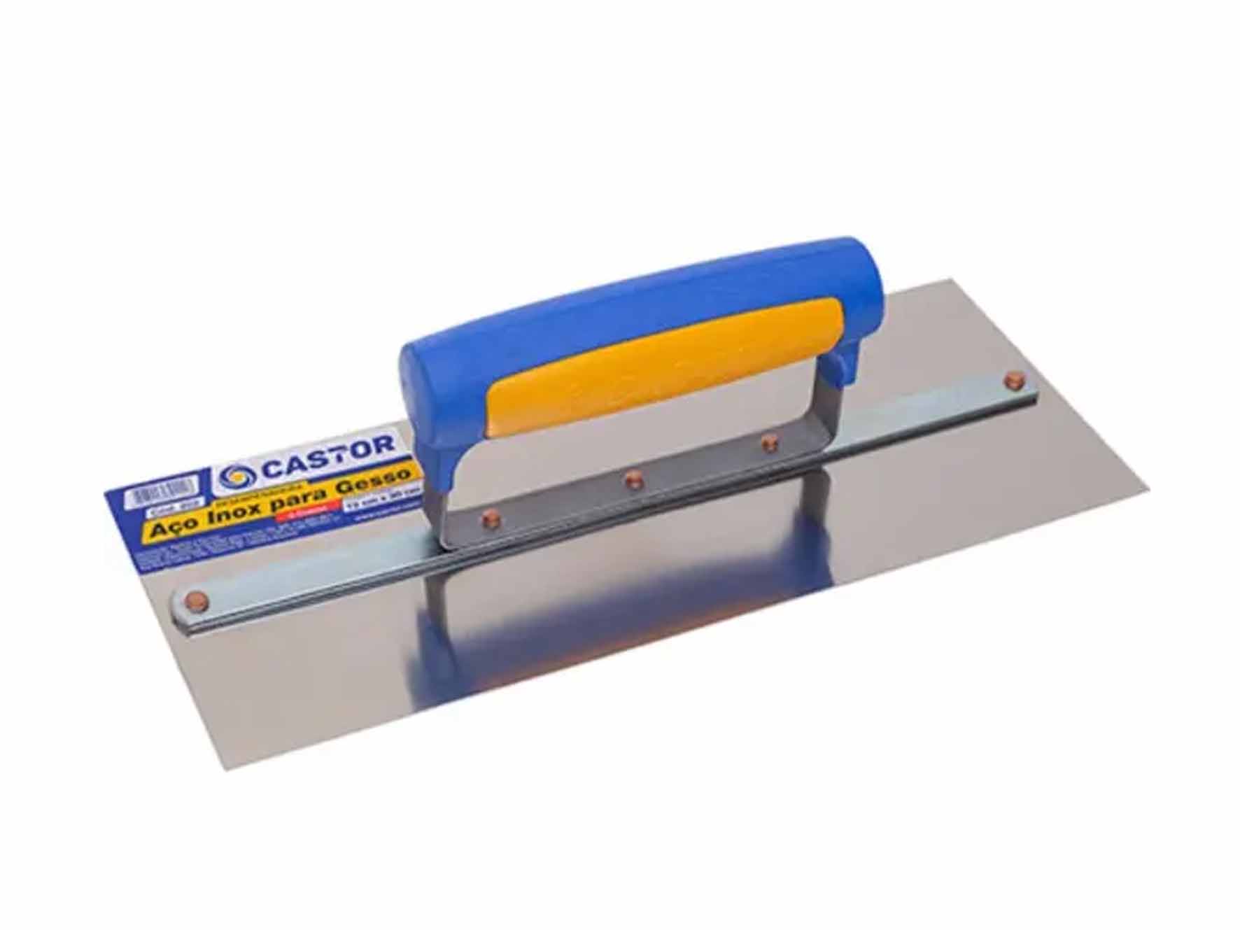 Indicação - Nivelamento e revestimento de superfícies com gesso. Vantagens Estrutura reforçada ideal para não entortar durante o manuseio. Super-resistente à oxidação. Descrição - Chapa de aço inox de 0,60 mm. - Cabo de madeira com formato anatômico. - Suporte longo, reforçado, com tratamento galvanizado. - Fixado na base com 5 rebites por solda eletrônica. Medida: 12 x 30 cm Cód. De Barras: 7898003892226 Embalagem: 6 peças Limpeza e Conservação Logo após o uso, retirar os resíduos do produto utilizado e lavar a desempenadeira em água corrente. Secar e guardar em local arejado.